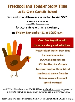 Preschool age and younger children are invited to come share a story and craft project with Mrs. Doeksen at SCCS.
